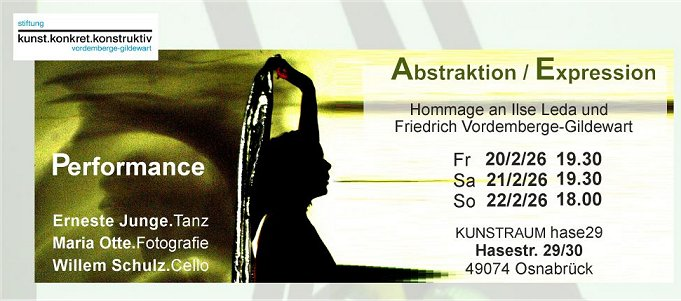 Gemeinsam mit dem Cellisten Willem Schulz will Erneste Junge jenen Raum der Kreativität, den Ilse Leda und Friedrich Vordemberge-Gildewart aufspannten, mit ihrer Performance „Abstraktion/Expression“ neu durchmessen. Der ungewöhnliche „Pas de deux“ von Bewegung und Musik soll an drei Abenden im Osnabrücker Kunstraum hase 29 jeweils am 20., 21. und 22. Februar in Szene gesetzt werden.